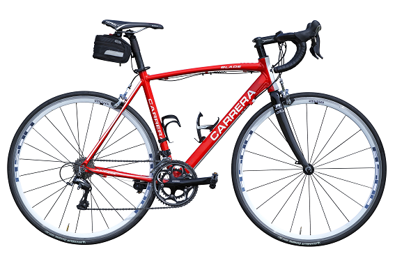 Dit is een Carrera-racefiets, dat zie je op de schuine buis staan. Maar wat je niet ziet, is pas écht belangrijk. Deze racer heeft namelijk Vivax-trapondersteuning. Via een druk op de knop schakel je de ondersteuning in op het moment dat je het nodig hebt. Op andere momenten fiets je gewoon zonder assistentie. De motor bestaat uit een soort aandrijfas die in de staande buis zit. De as draait op stroom, en zet zo de as van de pedalen in beweging. Het hele systeem is weggewerkt in het frame en de batterij – naar keuze een Lithium-Ion accu van 5,5 Ah (70 min) of 8,25 Ah (100 min) – is keurig netjes opgeborgen in een zadeltasje.
